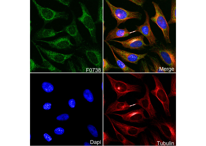 • Immunofluorescent analysis of Hela cells using F0738 (green, 1:50), Hoechst (blue) and tubulin (Red).