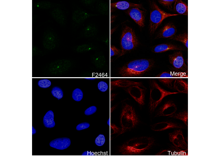 • Immunofluorescent analysis of Hela cells using F2464 (green, 1:50), Hoechst (blue) and tubulin (Red).