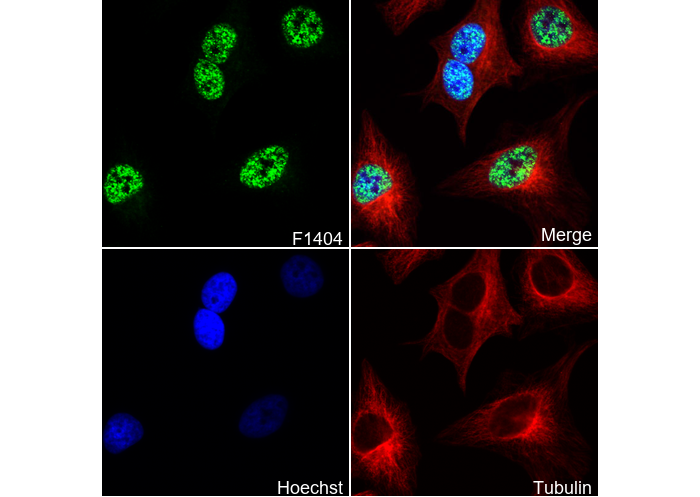 • Immunofluorescent analysis of Hela cells using F1404 (green, 1:200), Hoechst (blue) and tubulin (Red).