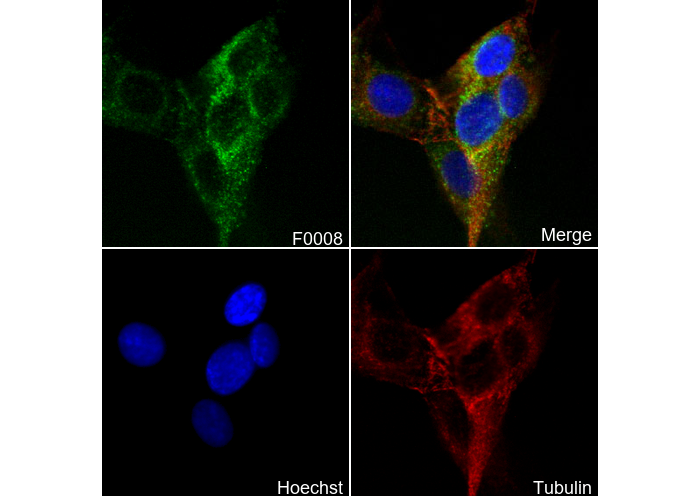 • Immunofluorescent analysis of U87-MG cells using F0008 (green, 1:250), Hoechst (blue) and tubulin (Red).