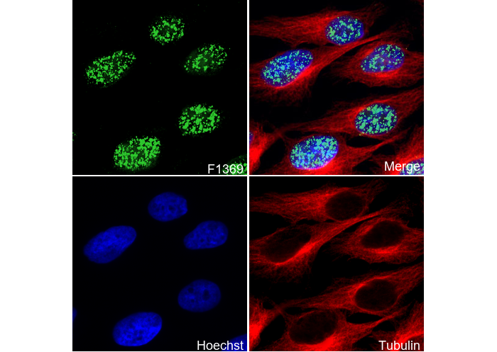 • Immunofluorescent analysis of Hela cells using F1369 (green, 1:100), Hoechst (blue) and tubulin (Red).