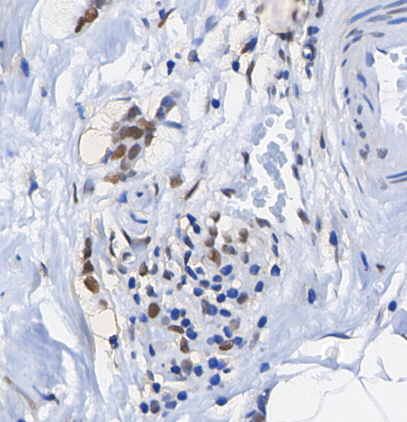 • Immunohistochemical analysis of formalin fixed paraffin embedded human Breast cancer tissue with F1369 at 1/200 dilution.