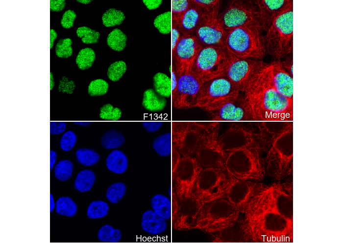 • Immunofluorescent analysis of A431 cells using F1342 (green, 1:200), Hoechst (blue) and tubulin (Red).