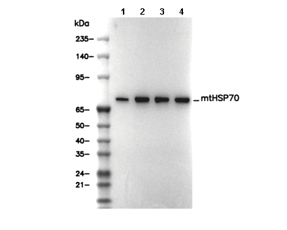 mtHSP70 Antibody [F16K11] recognizes total endogenous levels of mtHSP70 protein.