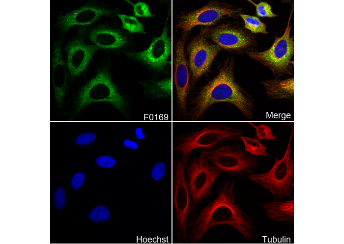 • Immunofluorescent analysis of Hela cells using F0169 (green, 1:100), Hoechst (blue) and tubulin (Red).