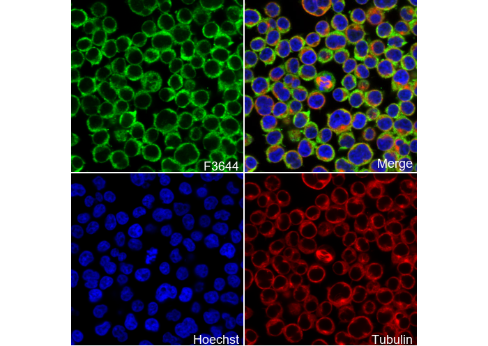 • Immunofluorescent analysis of Jurkat cells using F3644 (green, 1:250), Hoechst (blue) and tubulin (Red).