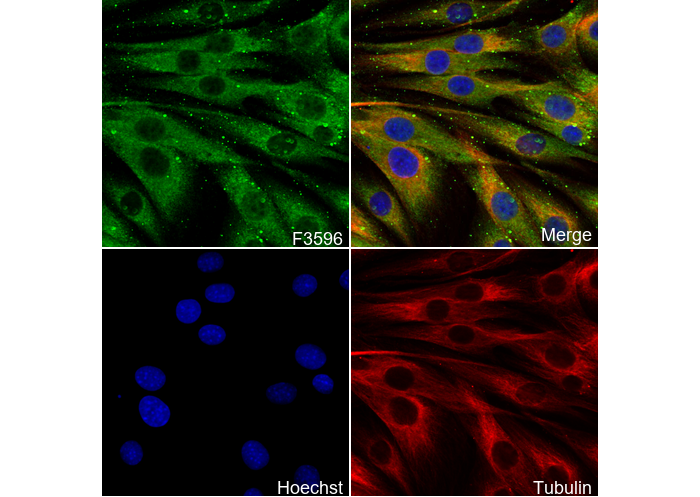 • Immunofluorescent analysis of C2C12 cells using F3596 (green, 1:100), Hoechst (blue) and tubulin (Red).