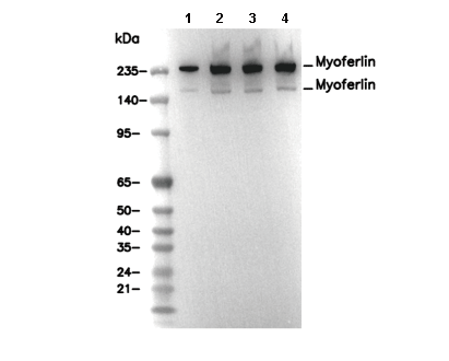 Myoferlin Antibody [M11L18] detects endogenous levels of total Myoferlin protein.