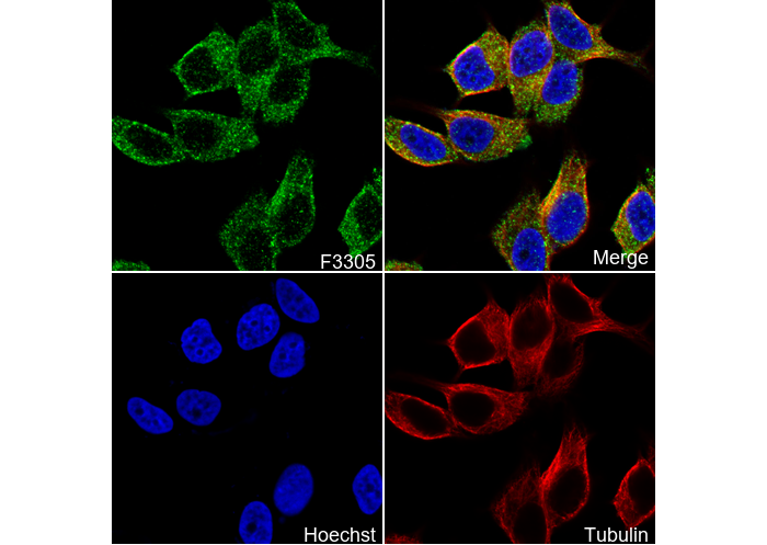 • Immunofluorescent analysis of MCF-7 cells using F3305 (green, 1:100), Hoechst (blue) and tubulin (Red).