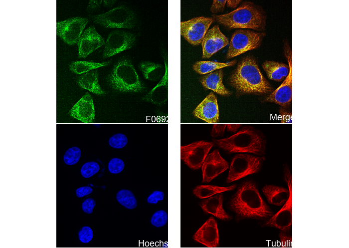• Immunofluorescent analysis of HepG2 cells using F0692 (green, 1:200), Hoechst (blue) and tubulin (Red).