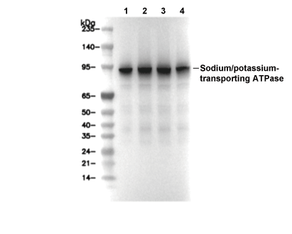 Na(+)/K(+)-transporting ATPase (pan α subunit) Antibody [G11K19] detects endogenous levels of total Na(+)/K(+)-transporting ATPase (pan α subunit) protein.
