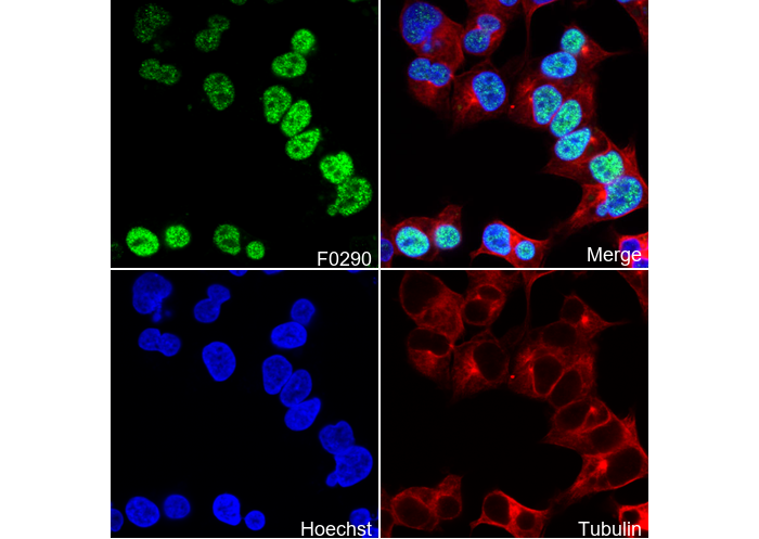 • Immunofluorescent analysis of NTERA-2 cells using F0290 (green, 1:200), Hoechst (blue) and tubulin (Red).
