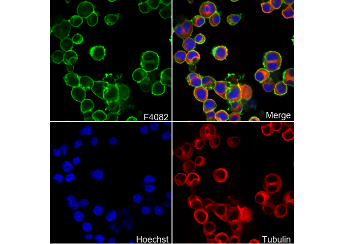 • Immunofluorescent analysis of Neuro-2a cells using F4082 (green, 1:50), Hoechst (blue) and tubulin (Red).