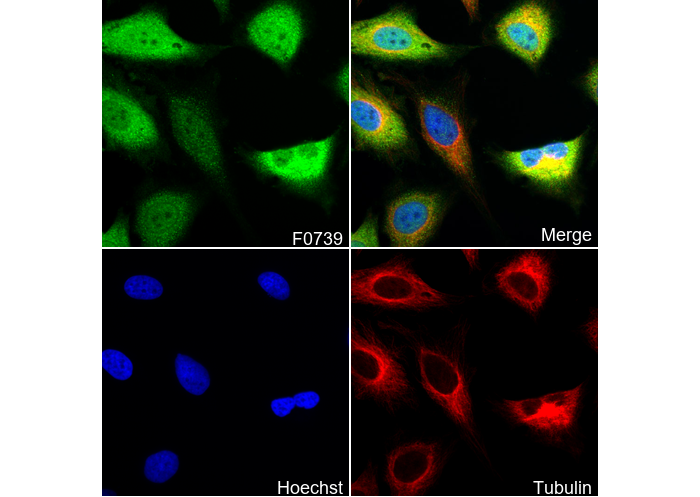 • Immunofluorescent analysis of Hela cells using F0739 (green, 1:200), Hoechst (blue) and tubulin (Red).