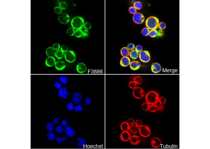 • Immunofluorescent analysis of Jurkat cells using F3886 (green, 1:100), Hoechst (blue) and tubulin (Red).