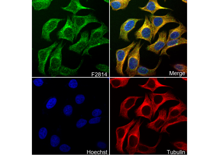 • Immunofluorescent analysis of MCF-7 cells using F2814 (green, 1:2000), Hoechst (blue) and tubulin (Red).
