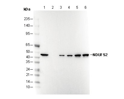 • Lane 1: HAP1 , Lane 2: HAP1 (KO NDUFS2) , Lane 3: HeLa , Lane 4: Jurkat , Lane 5: Mouse brain , Lane 6: Rat brain