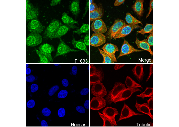 • Immunofluorescent analysis of HepG2 cells using F1633 (green, 1:100), Hoechst (blue) and tubulin (Red).