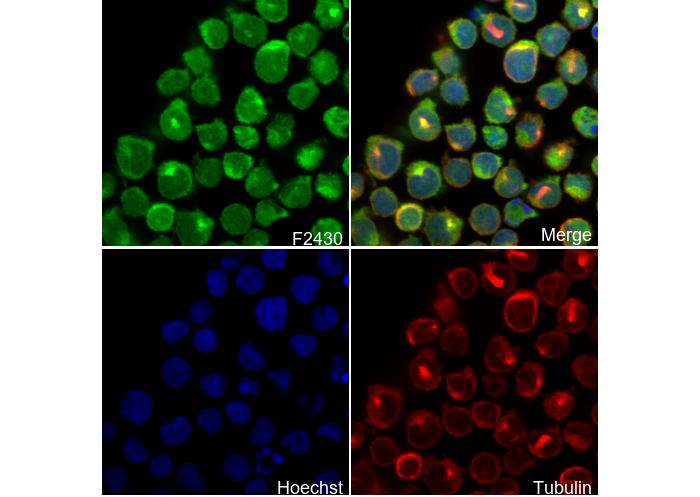• Immunofluorescent analysis of HL-60 cells using F2430 (green, 1:70), Hoechst (blue) and tubulin (Red).