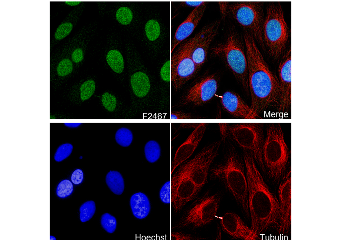 • Immunofluorescent analysis of Hela cells using F2467 (green, 1:100), Hoechst (blue) and tubulin (Red).
