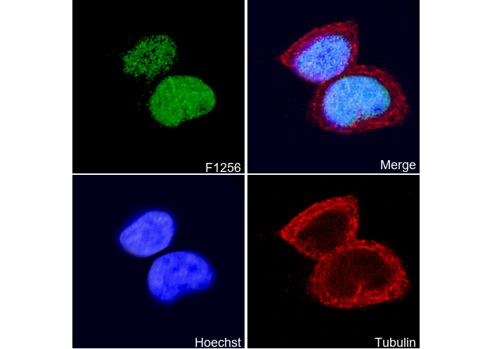 • Immunofluorescent analysis of HEK293 cells using F1256 (green, 1:400), Hoechst (blue) and tubulin (Red).