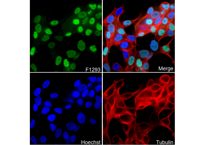 • Immunofluorescent analysis of LNCaP cells using F1293 (green, 1:100), Hoechst (blue) and tubulin (Red).
