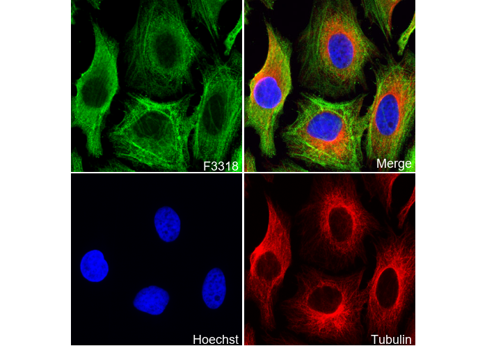 • Immunofluorescent analysis of Hela cells using F3318 (green, 1:250), Hoechst (blue) and tubulin (Red).