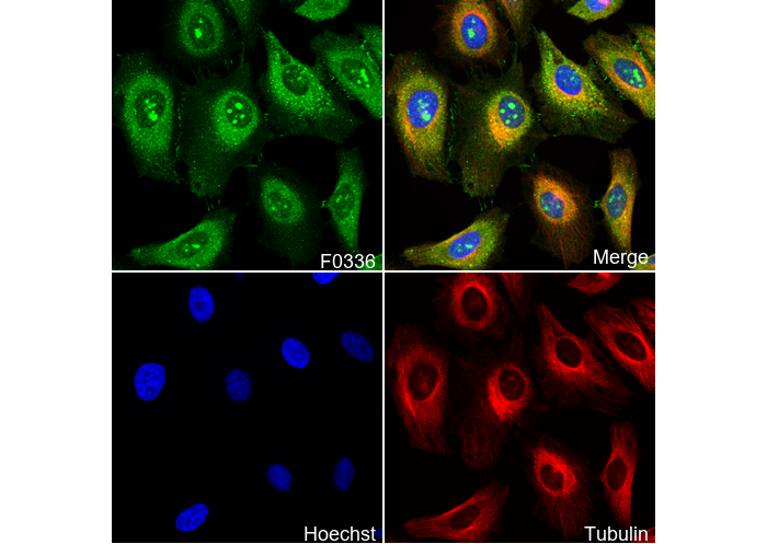 • Immunofluorescent analysis of Hela cells using F0336 (green, 1:800), Hoechst (blue) and tubulin (Red).