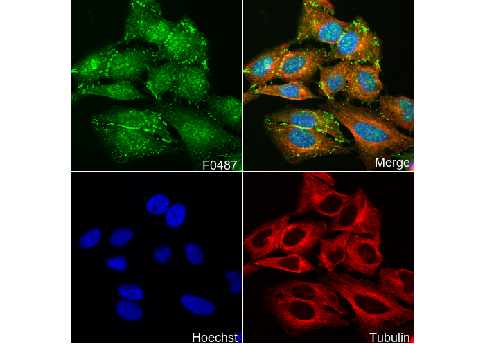 • Immunofluorescent analysis of Hela cells using F0487 (green, 1:1600), Hoechst (blue) and tubulin (Red).
