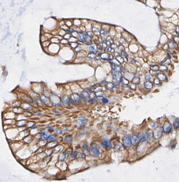 • Immunohistochemical analysis of formalin fixed paraffin embedded human Colorectal cancer tissue with F0487 at 1/100 dilution.