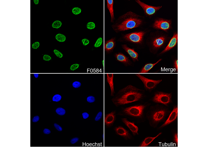 • Immunofluorescent analysis of Hela cells using F0584 (green, 1:400), Hoechst (blue) and tubulin (Red).