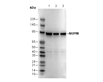 NUP98 Antibody [P16L18] detects endogenous levels of total NUP98 protein. Reactivity by immunofluorescence is human only.