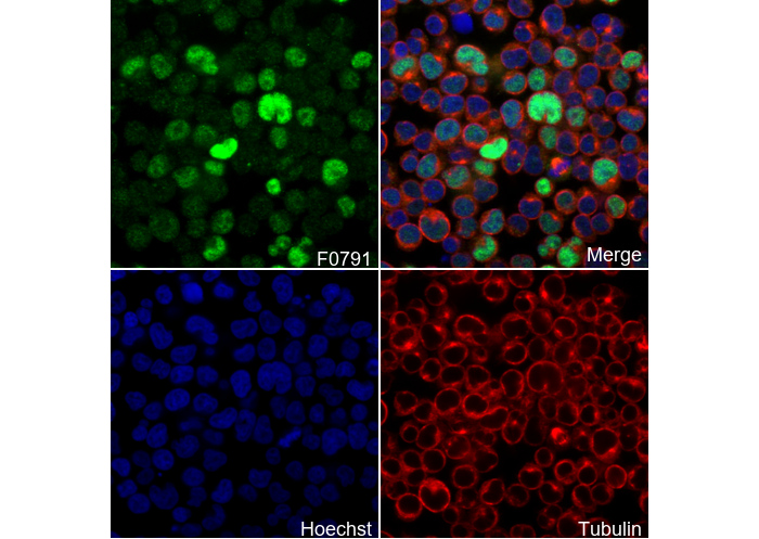• Immunofluorescent analysis of Jurkat cells using F0791 (green, 1:100), Hoechst (blue) and tubulin (Red).