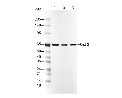 Oct-2 Antibody [B23J20] recognizes endogenous levels of total Oct-2 protein. The Oct-2 targeted by this antiboy is POU domain, class 2, transcription factor 2 (SwissProt ID: P09086).