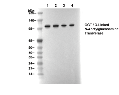 OGT/O-Linked N-Acetylglucosamine Transferase Antibody [E11N9] detects endogenous levels of total OGT/O-Linked N-Acetylglucosamine Transferase protein.