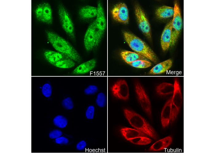 • Immunofluorescent analysis of U-87 MG cells using F1557 (green, 1:30), Hoechst (blue) and tubulin (Red).