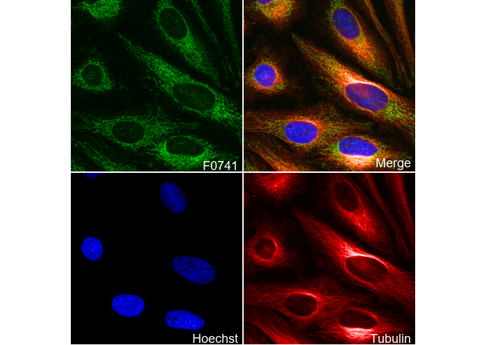 • Immunofluorescent analysis of Hela cells using F0741 (green, 1:800), Hoechst (blue) and tubulin (Red).