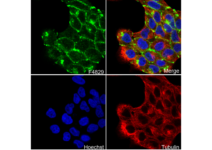 • Immunofluorescent analysis of A431 cells using F4829 (green, 1:50), Hoechst (blue) and tubulin (Red).