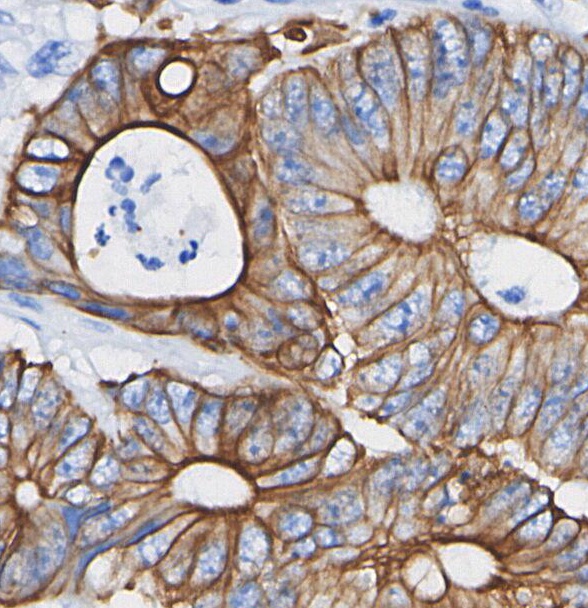 • Immunohistochemical analysis of formalin fixed paraffin embedded human Colorectal cancer tissue with F1045 at 1/100 dilution.
