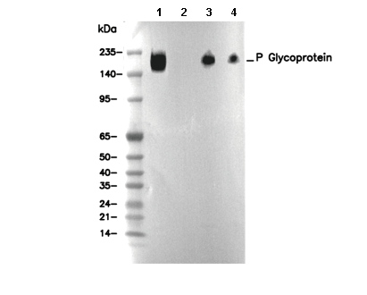 • Lane 1: HepG2, Lane 2: HepG2 (KO P Glycoprotein), Lane 3: Mouse brain, Lane 4: Rat brain