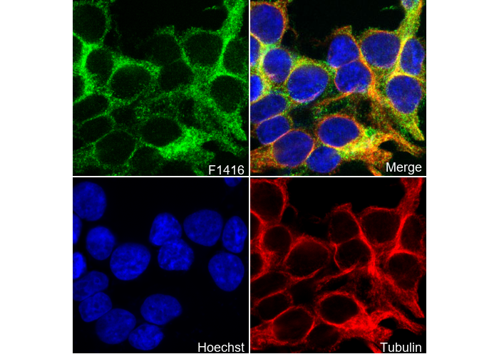 • Immunofluorescent analysis of 293T cells using F1416 (green, 1:50), Hoechst (blue) and tubulin (Red).
