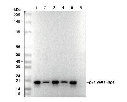 • Lane 1: HUVEC , Lane 2: SH-SY5Y , Lane 3: COS , Lane 4: MCF-7 , Lane 5: Hela , Lane 6: HeLa (KO Waf1/Cip1)