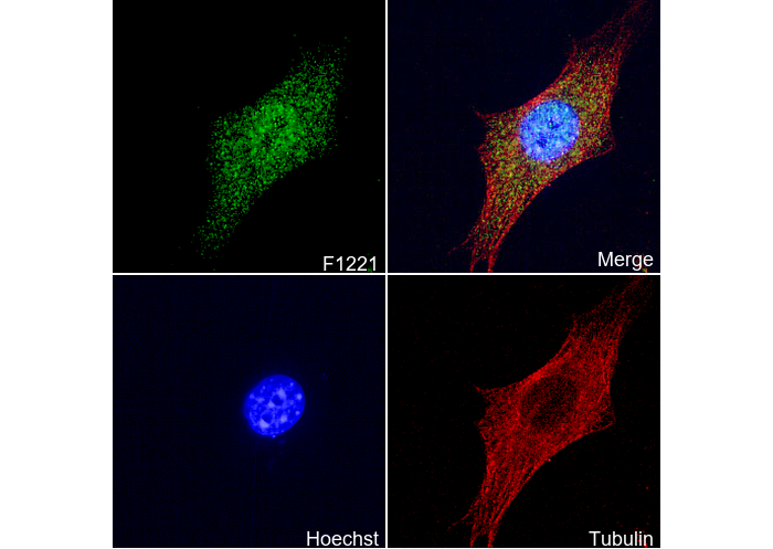 • Immunofluorescent analysis of Hela cells using F1221 (green, 1:100), Hoechst (blue) and tubulin (Red).