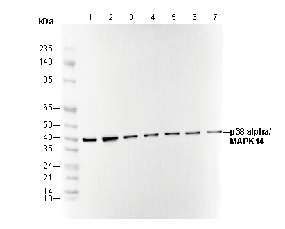 p38α/MAPK14 Antibody [J11A5] recognizes endogenous levels of total p38 alpha/MAPK14 protein.