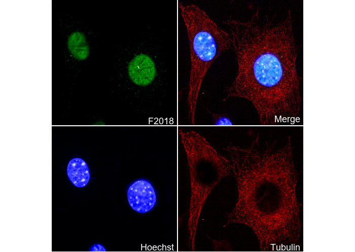 • Immunofluorescent analysis of NIH/3T3 cells using F2018 (green, 1:500), Hoechst (blue) and tubulin (Red).