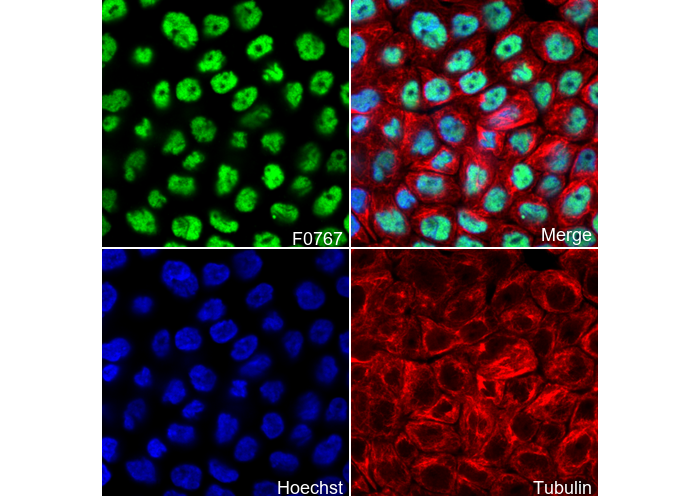 • Immunofluorescent analysis of A431 cells using F0767 (green, 1:400), Hoechst (blue) and tubulin (Red).