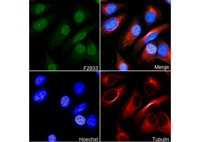 • Immunofluorescent analysis of Hela cells using F2933 (green, 1:250), Hoechst (blue) and tubulin (Red).