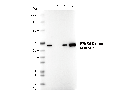 Anti-P70 S6 Kinase β/SRK-N-terminal Rabbit Antibody [G11B4] recognizes endogenous levels of total P70 S6 Kinase β/SRK-N-terminal protein.