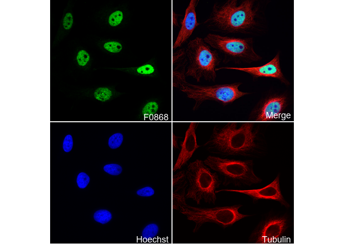 • Immunofluorescent analysis of Hela cells using F0868 (green, 1:100), Hoechst (blue) and tubulin (Red).