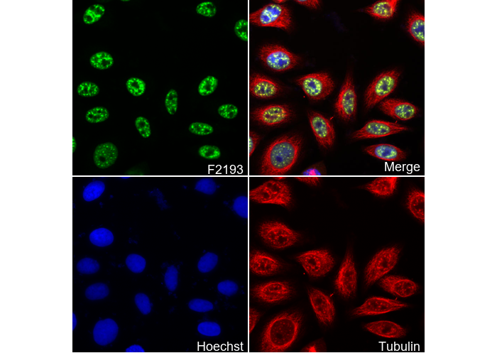 • Immunofluorescent analysis of MCF7 cells using F2193 (green, 1:100), Hoechst (blue) and tubulin (Red).